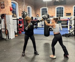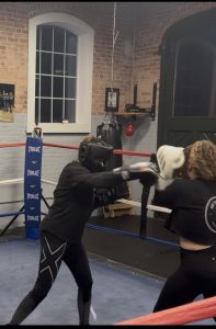 I’ve never felt like the old lady in the gym. When my chest is heaving and my legs are wobbling, Kathleen doesn’t coddle me or patronize me by asking, “Oooh, do you need to rest?” She just says very reassuringly and matter-of-factly, “You’re okay. I know you can do this.” And over time she helped me build enough confidence to try sparring. Even though I’ve sworn up and down, I would never spar. (I should know by now to never say never.) There’s a mutual trust in the ring. I’m fully aware she could knock my lights out in about three seconds but graciously chooses not to, and she knows I’m not about to go rogue and start throwing wild haymakers like I’ve completely lost my mind. It’s invigorating, although that may change very quickly when I’m not the one who gets to do most of the punching.
